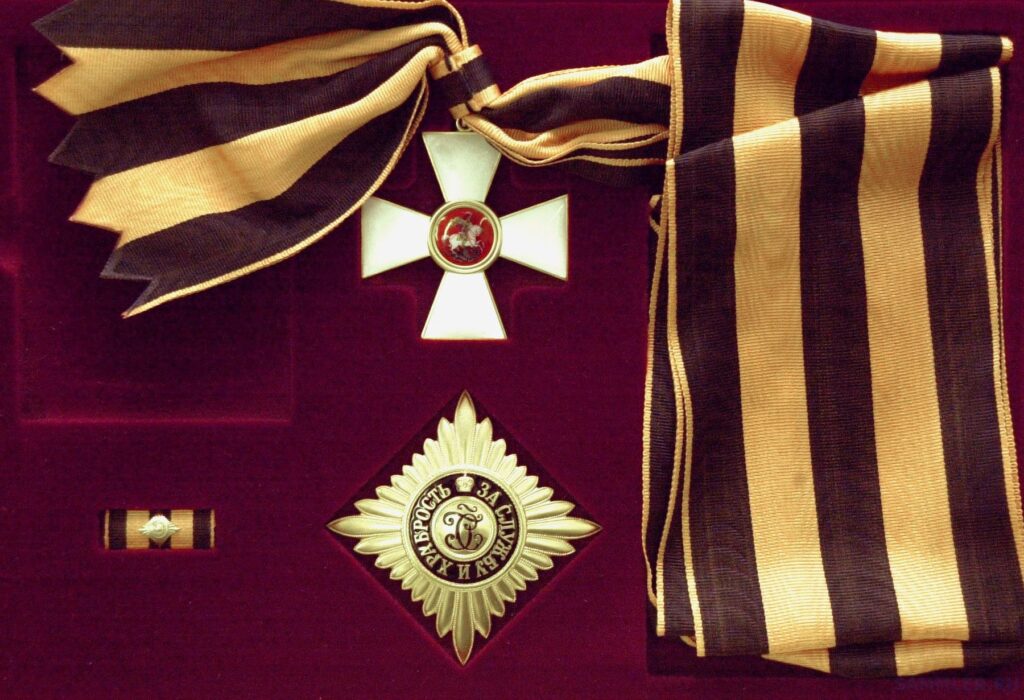 Екатерина II в 1769 году, 26 ноября, учредила «Императорский Военный орден Святого великомученика Победоносца Георгия» в четырёх степенях под девизом «За службу и храбрость». Это была высшая военная награда Российской империи за боевые заслуги. Орденом награждались офицеры и генералы за военные подвиги: за полную победу в бою, за взятие крепости, захват неприятельского знамени, пленение главнокомандующего вражеского войска. В статуте награды указывалось: «Сей орден никогда не снимать».