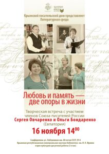 В литературную среду, 16 ноября в 14 часов, приглашаем вас на творческую встречу в рамках литературного клуба «Крымский писательский дом» с членами Союза писателей России Сергеем Овчаренко и Ольгой Бондаренко. Встреча состоится по традиции в досуговом отделе Крымской республиканской библиотеки.