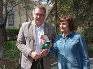 Анатолий Труба вручил Почётную грамоту Союза писателей России директору Централизованной библиотечной системы Феодосии Оксане Филатовой и Поздравительный адрес в честь юбилея известному крымскому писателю Эдуарду Абрамову.