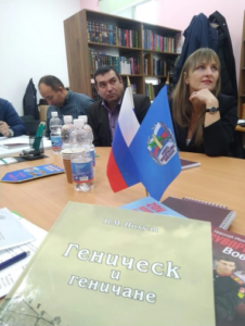 Время в пути летит незаметно, историческое фото членов делегации на фоне стелы при въезде в город, и вот мы уже в Геническе. Город встретил нас буднично, по-деловому, не смотря на субботний день, повсюду кипела работа. Многочисленная дорожная техника без устали утюжила широкие улицы, и узкие переулочки южного города. Нам даже пришлось ехать в объезд, чтобы добраться до городской юношеской библиотеки, где было запланировано проведение конференции.