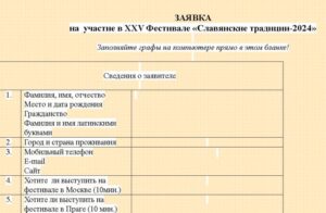 4. Желающие принять участие в Фестивале должны заявить об этом в оргкомитет, представив с 01 февраля до 01 мая 2024 года заявку на участие в Фестивале по прилагаемой форме на электронный адрес: slavtraditions@mail.ru