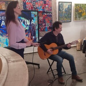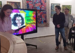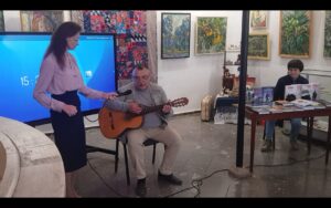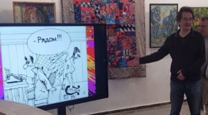 Затем слово было предоставлено иногородним гостям. Первым выступил гость московский – который, как оказалось, на самом деле уже переехал к нам из столицы насовсем и живёт в одном из посёлков Большой Феодосии. Алексей Евтушенко – писатель-фантаст, поэт, сценарист, автор и исполнитель собственных песен, является лауреатом фестивалей авторской песни «Большой Донбасс» и «Эсхар». А кроме того – художник-карикатурист, опубликовавший в различных изданиях страны сотни карикатур и рисунков, за что в 1999 году был удостоен премии «Золотой телёнок» «Литературной Газеты» («Клуба 12 стульев»). Знакомство с ним началось именно с этой грани: присутствующим был продемонстрирован слайд-фильм из его карикатур (специально созданный для мероприятия сотрудником музея Натальей Яловой). Зал от души хохотал, – тем более что часть рисунков была на литературную тему! Затем Алексей Анатольевич прочёл миниатюру из книги «Невыдуманные рассказы», над которой сейчас работает. Весело начавшееся выступление завершилось серьёзно: прозвучала авторская песня на военную тему.
